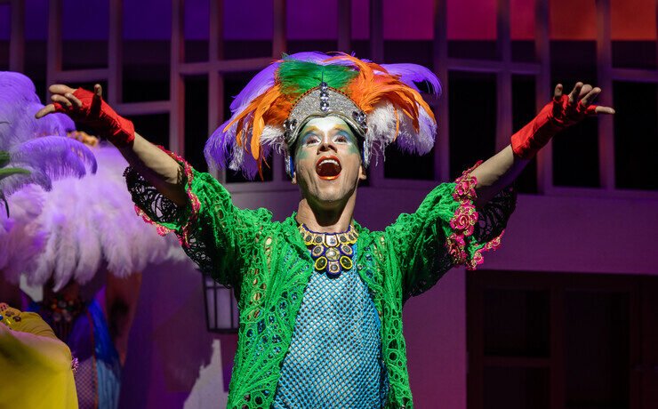 A person dressed in masquerade attire singing out dramatically.