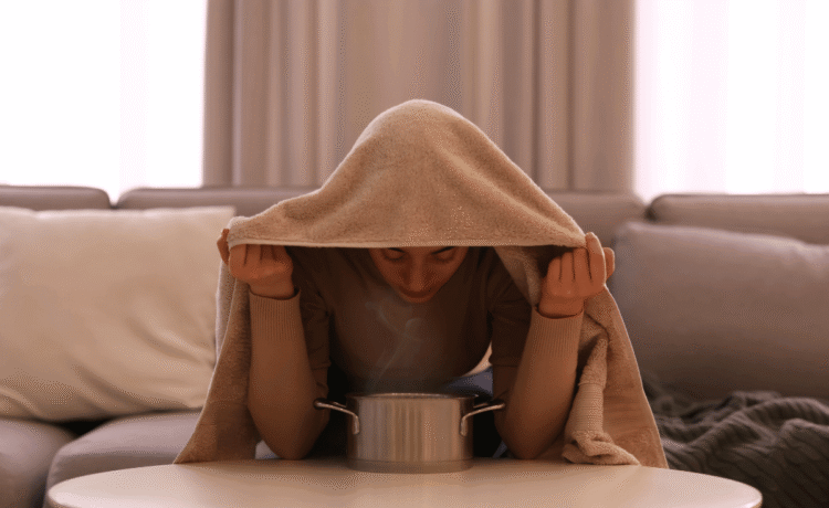 Turn the heat off and lean over the pot with your eyes closed. Be sure not to get too close or you’ll get a steam burn! I’ve found that as the water cools I’ll edge closer. You can also drape a towel over your head to trap more of the steam in.