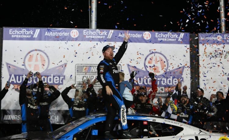NASCAR: Autotrader 400Feb 22, 2026; Hampton, Georgia, USA; NASCAR Cup Series driver Tyler Reddick celebrates the win at EchoPark Speedway. Mandatory Credit: Mady Mertens-Imagn Images